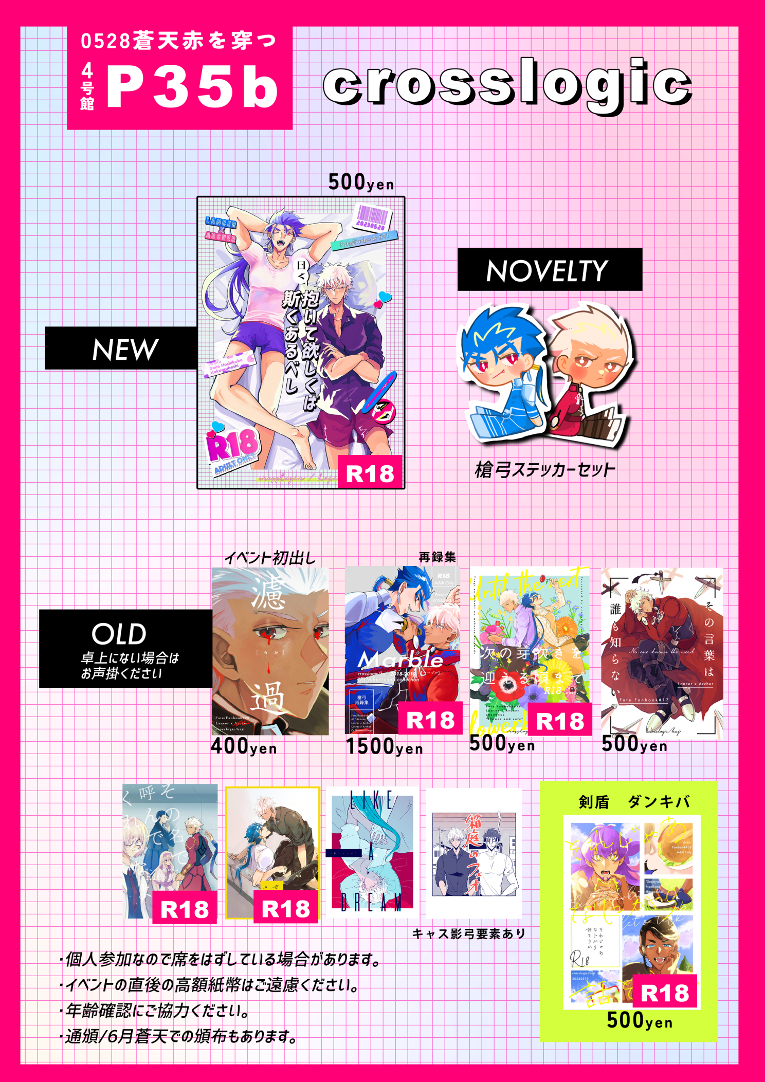 ・卓上にない本についてはお声かけください。 ・ステッカーは新刊のノベルティです(無配ではありません) ・イベント開始直後の高額紙幣は対応しかねます。 ・年齢確認にご協力ください。 ・当日ははじ一人の参加ですので席を外している場合があります。 ・スケブはサークルでご購入いただいた方であれば対応可能です。 ・当日は新刊表紙絵の新刊表紙絵のポスターを建てています。 pixiv: 新刊サンプル | 準新刊サンプル | 他既刊リスト