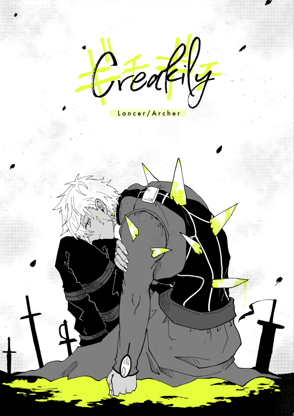 Fate/槍弓 #9 | 20190825発行/pixiv A5/P20/表紙地券紙・2色刷り 完売済み 日光印刷さんのスモーキーフェアを使わせていただきました。錆びついた剣をイメージして灰色の紙に黒と蛍光イエローの2色…